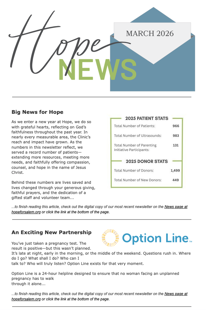 We at Hope Pregnancy Clinic are thankful to partner with you in our mission to serve and empower women facing unplanned pregnancies and to introduce them to Jesus. It is with your time, prayer and material and financial support that we are able to fully say "you can do this, we will walk with you" when a woman feels alone and unable to parent her baby.